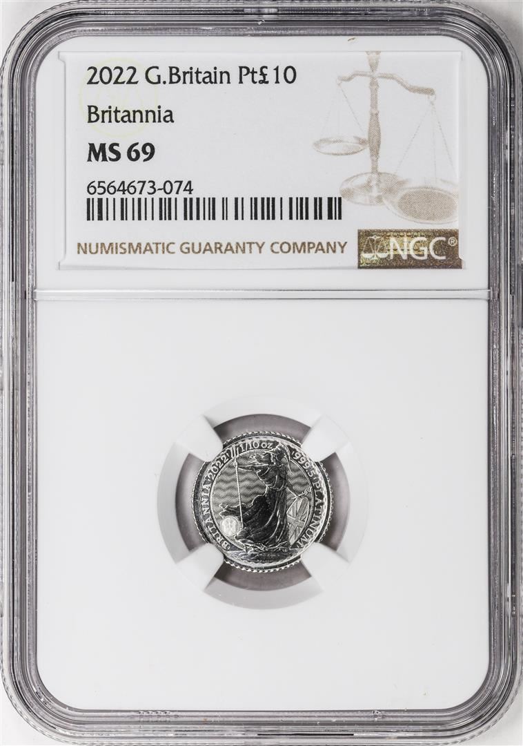 One 2022 Great Britain 10 Pounds Britannia 1/10oz Platinum Coin NGC MS69. NGC Certified.