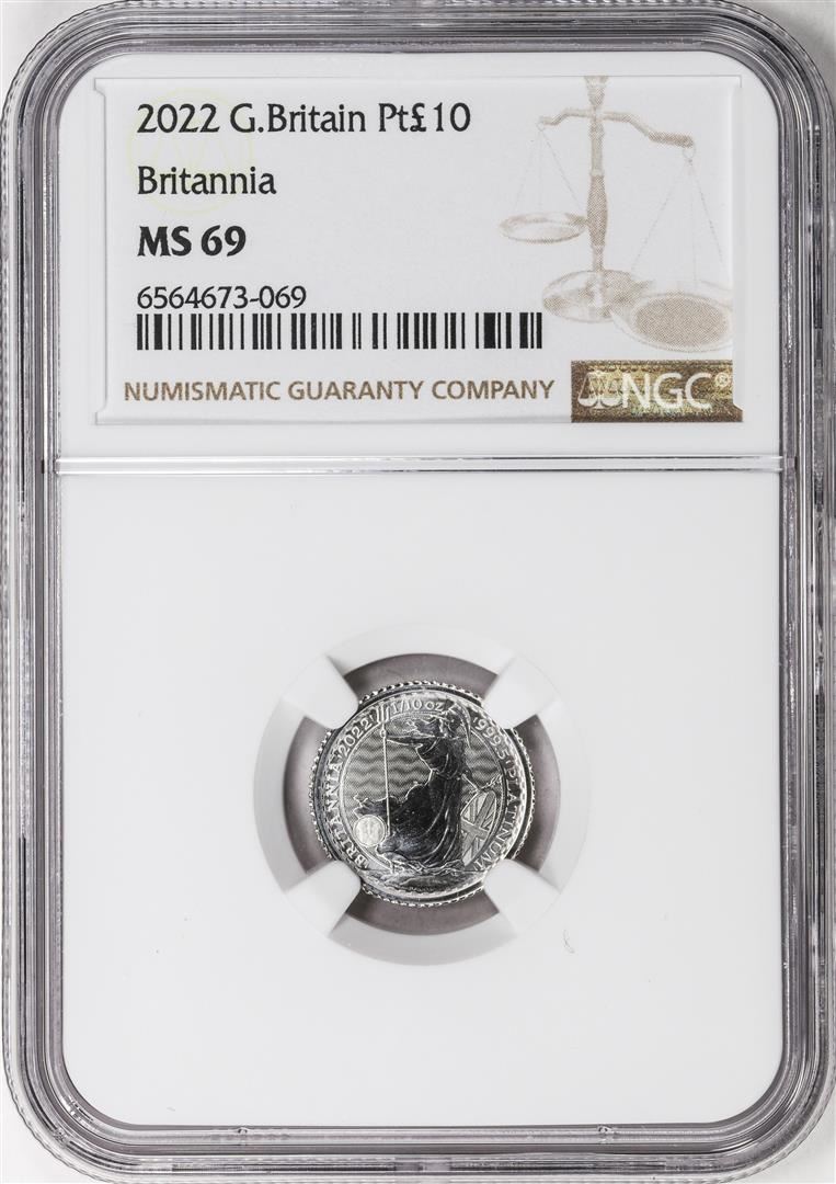 One 2022 Great Britain 10 Pounds Britannia 1/10oz Platinum Coin NGC MS69. NGC Certified.