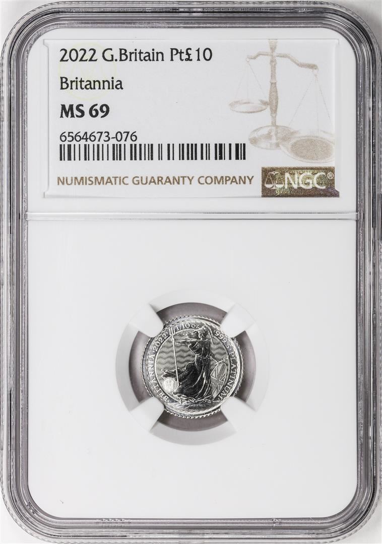 One 2022 Great Britain 10 Pounds Britannia 1/10oz Platinum Coin NGC MS69. NGC Certified.