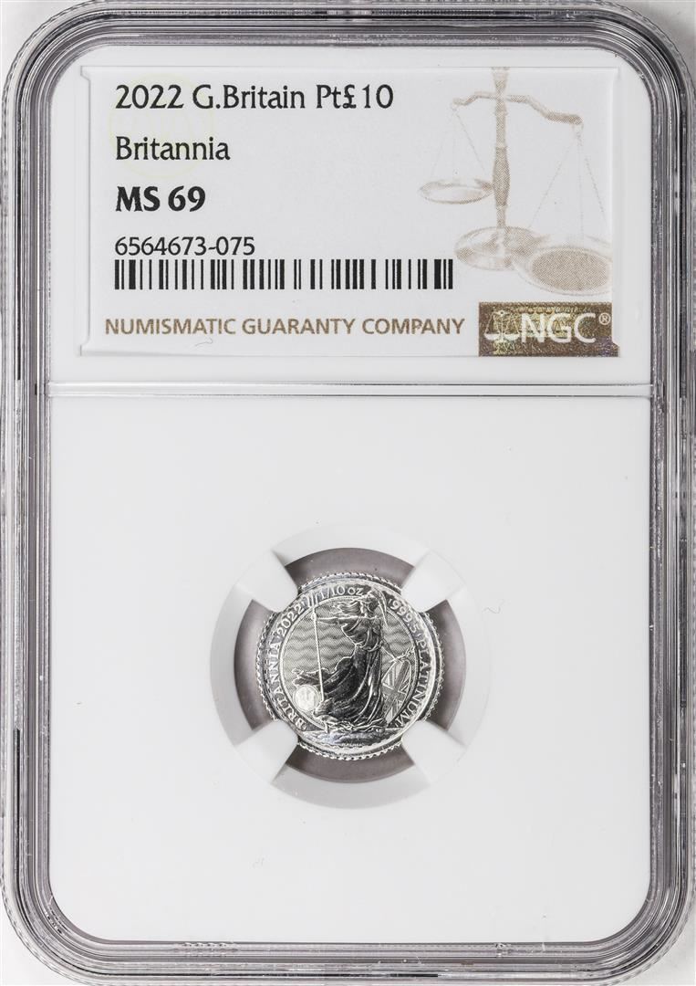One 2022 Great Britain 10 Pounds Britannia 1/10oz Platinum Coin NGC MS69. NGC Certified.