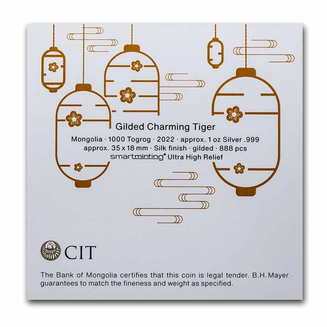 2022 Mongolia 1000 Togrog 1oz Silver Glided Charming Year of Tiger Coin w/ Box & COA