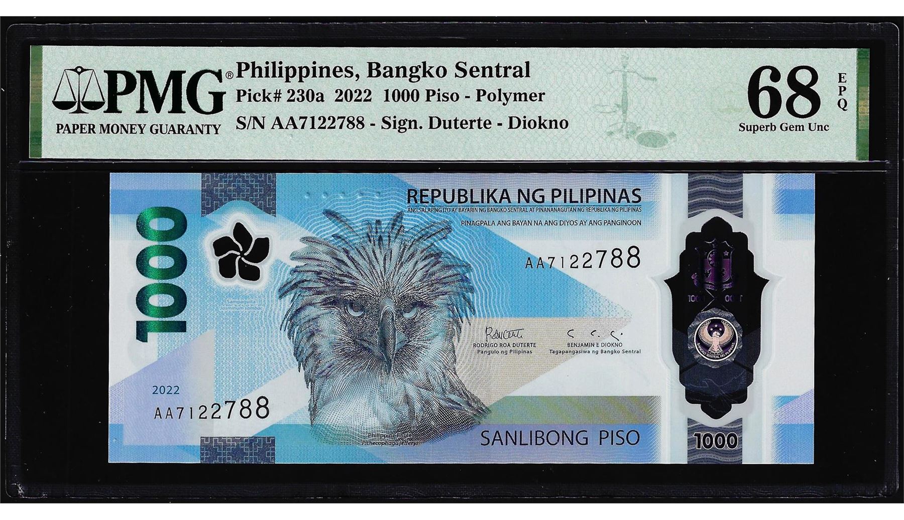 One 2022 Philippines Central Bank 1000 Piso Note P230a PMG Superb Gem Uncirculated 68EPQ. PMG Certified.