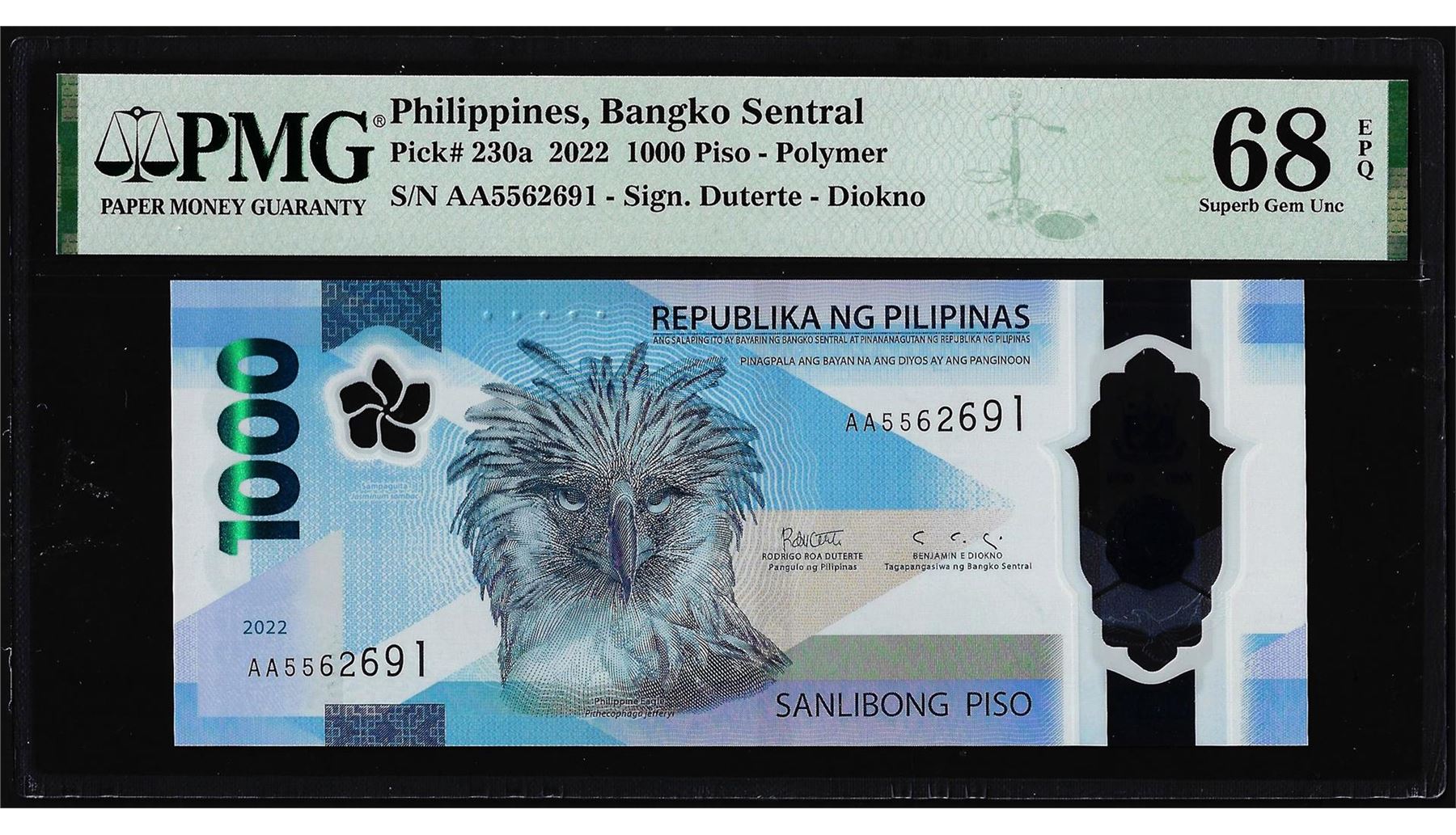 One 2022 Philippines Central Bank 1000 Piso Note P230a PMG Superb Gem Uncirculated 68EPQ. PMG Certified.