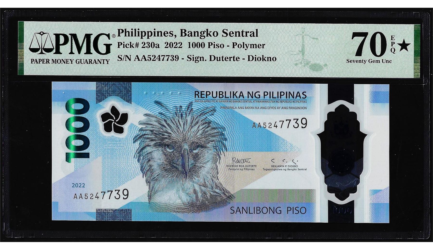 One 2022 Philippines Central Bank 1000 Piso Note PMG Seventy Gem Uncirculated 70EPQ* Star. PMG Certified.