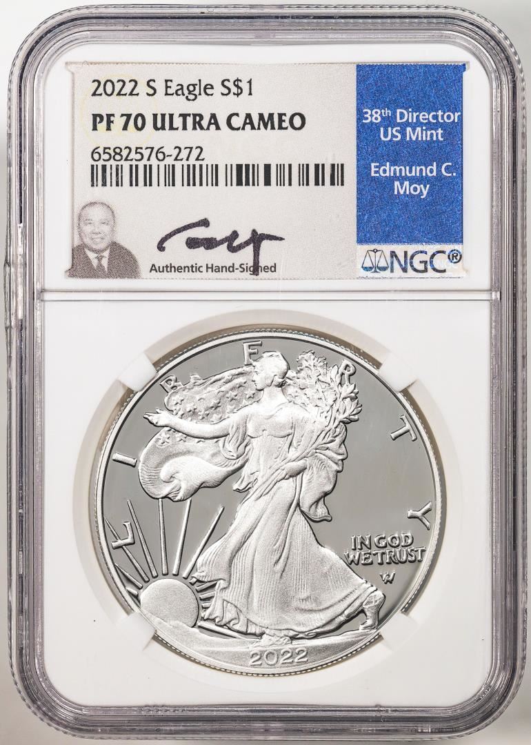 2022-S $1 Proof American Silver Eagle Coin NGC PF70 Ultra Cameo Edmund Moy Signature