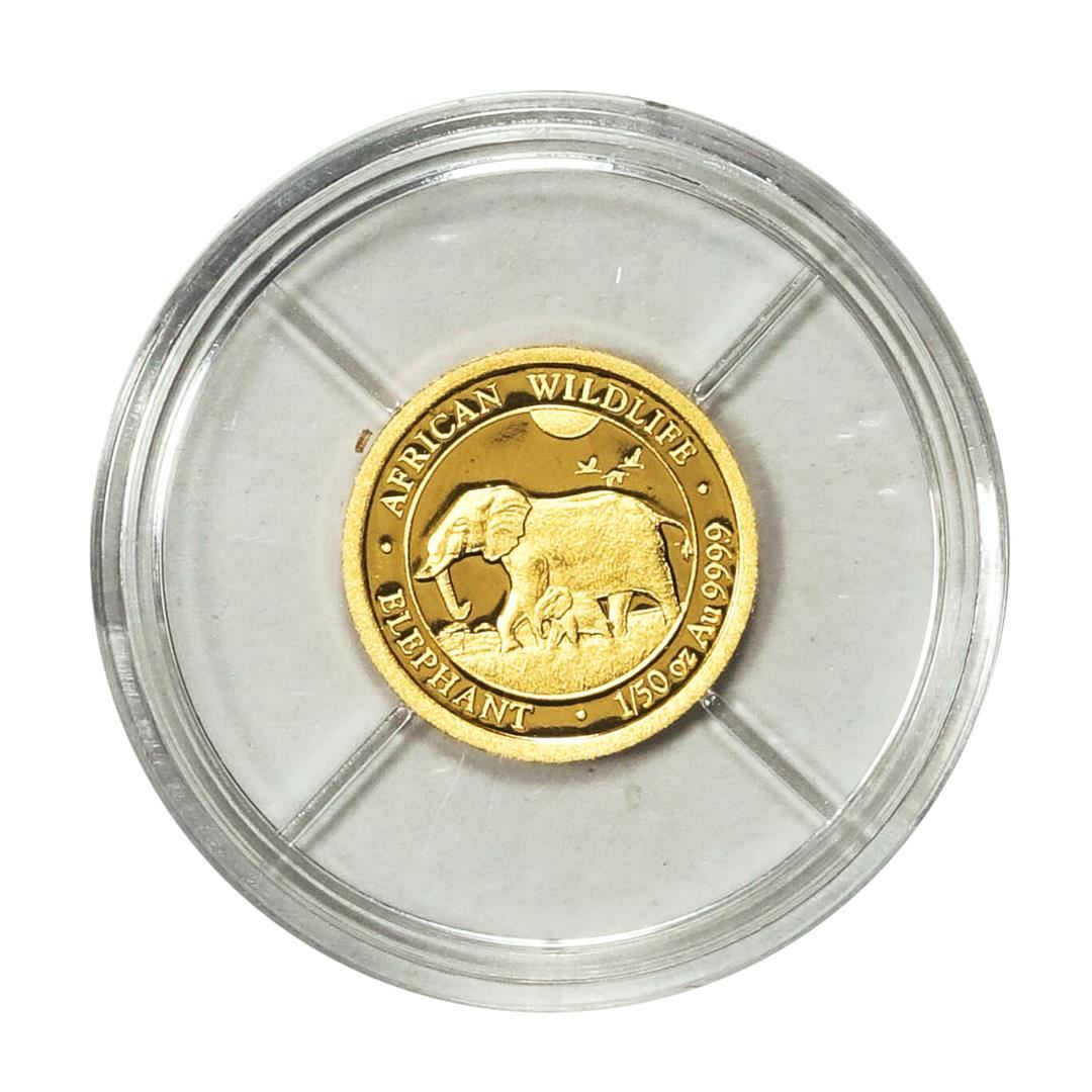 One 2022 Somalia Republic African Wildlife Elephant 20 Shillings 1/50 oz Gold Coin.