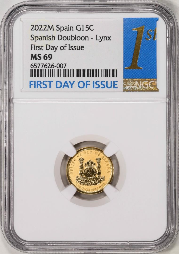 One 2022M Spain 15 Euro Cent Lynx Gold Doubloon Coin NGC MS69 FDOI. NGC Certified.