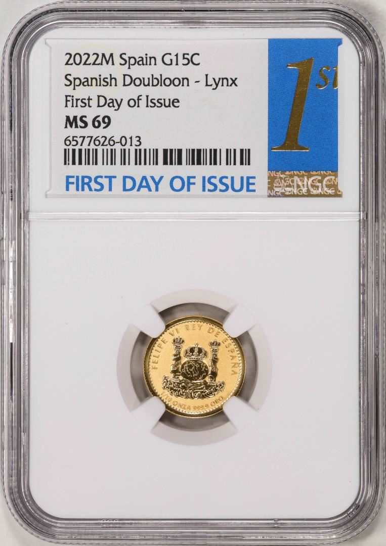 One 2022M Spain 15 Euro Cent Lynx Gold Doubloon Coin NGC MS69 FDOI. NGC Certified.