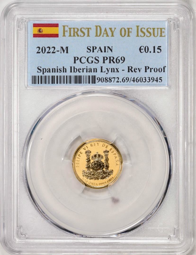 One 2022M Spain 15 Euro Cent Reverse Proof Lynx Gold Doubloon Coins PCGS PR69 FDOI. PCGS Graded.