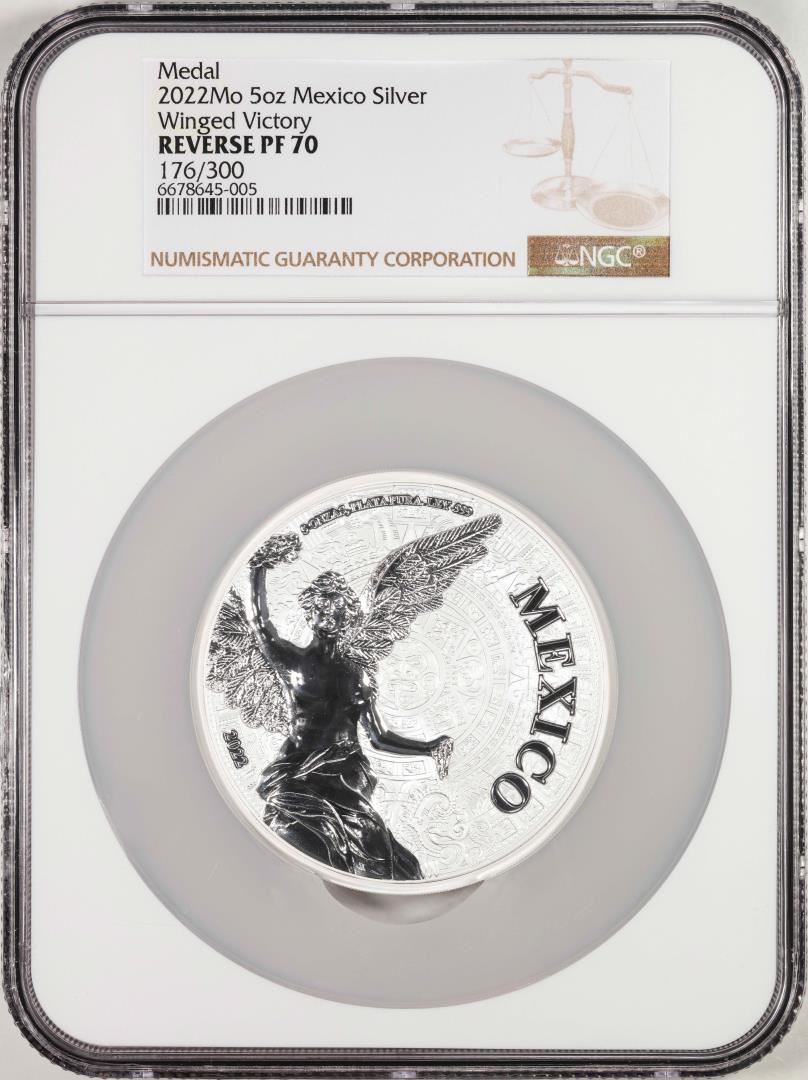 One 2022Mo Mexico Reverse Proof Winged Victory 5oz Silver Medal NGC Reverse PF70. NGC Certified.