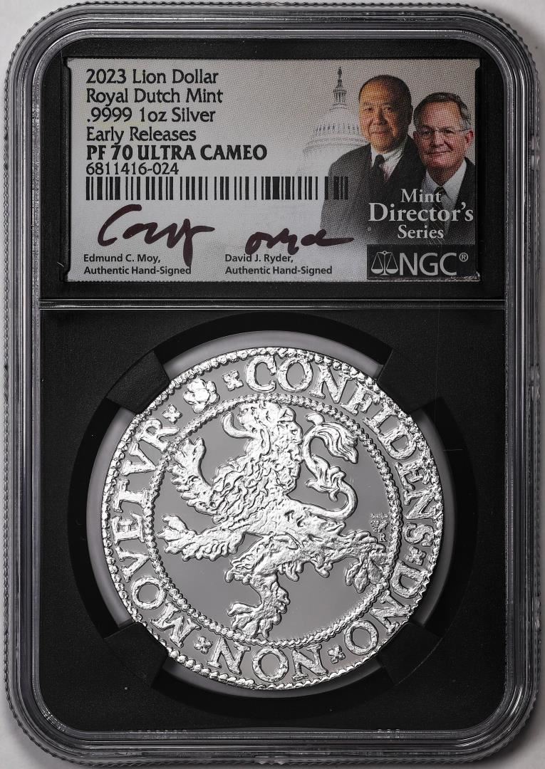 One 2023 Netherlands Proof Lion Dollar Silver Coin NGC PF70 Ultra Cameo Moy Signature. NGC Certified.