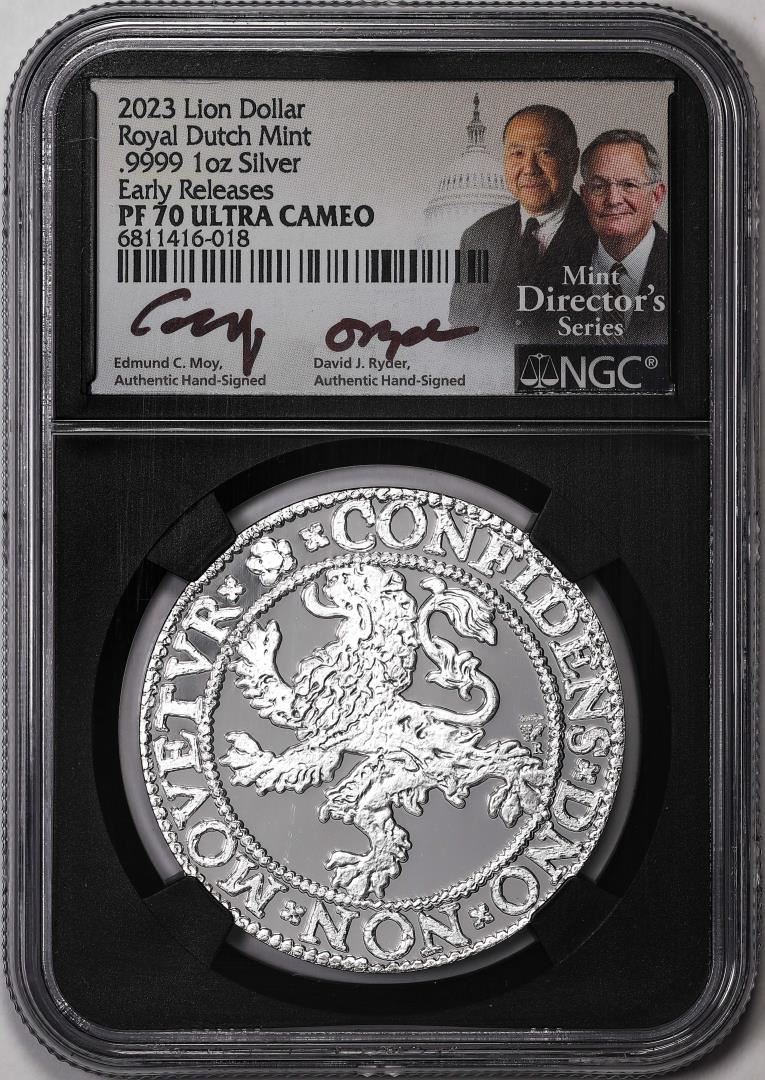 One 2023 Netherlands Proof Lion Dollar Silver Coin NGC PF70 Ultra Cameo Moy Signature. NGC Certified.