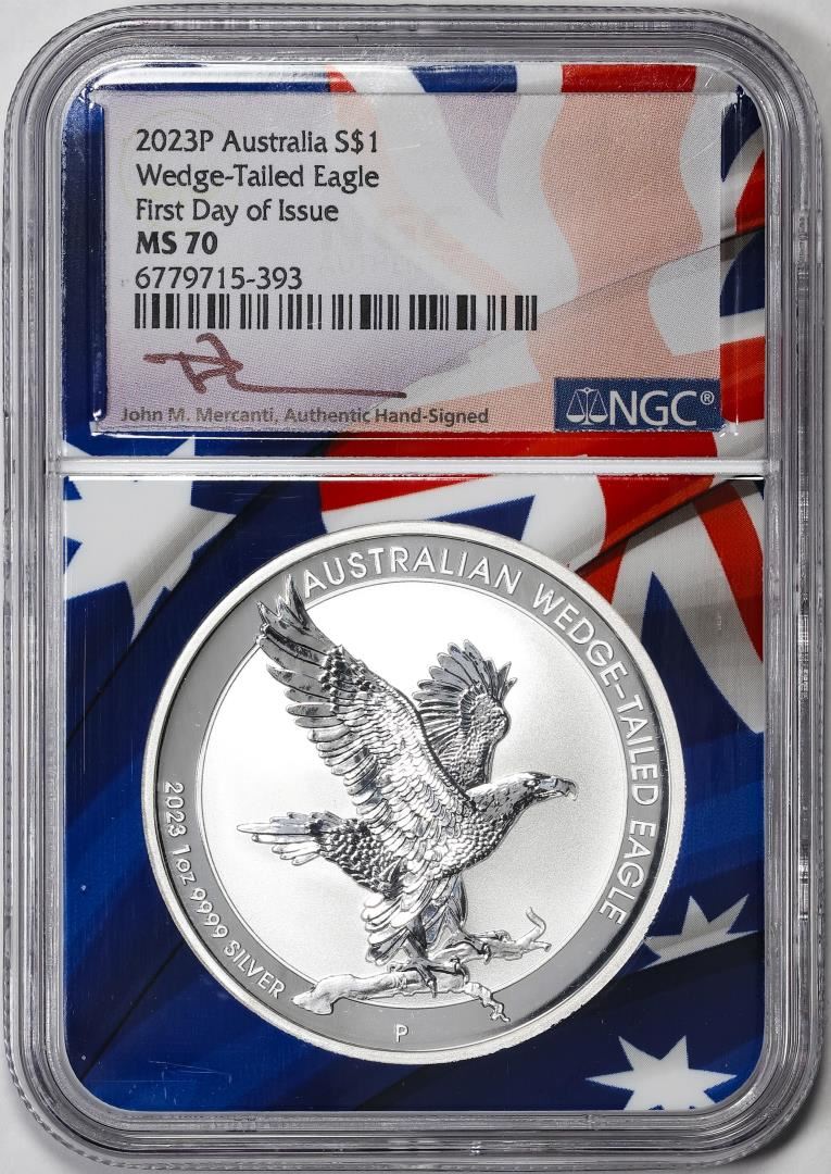 2023P Australia $1 Wedge Tailed Eagle Silver Coin NGC MS70 FDOI Flag Core Mercanti