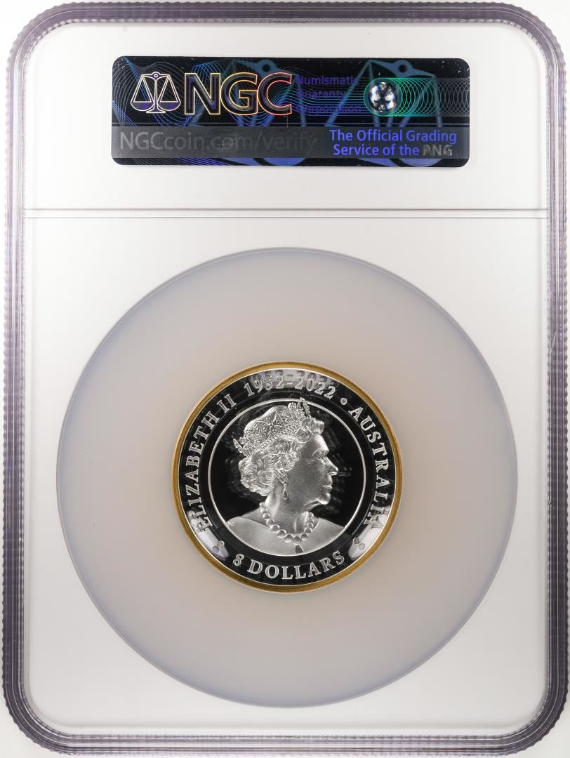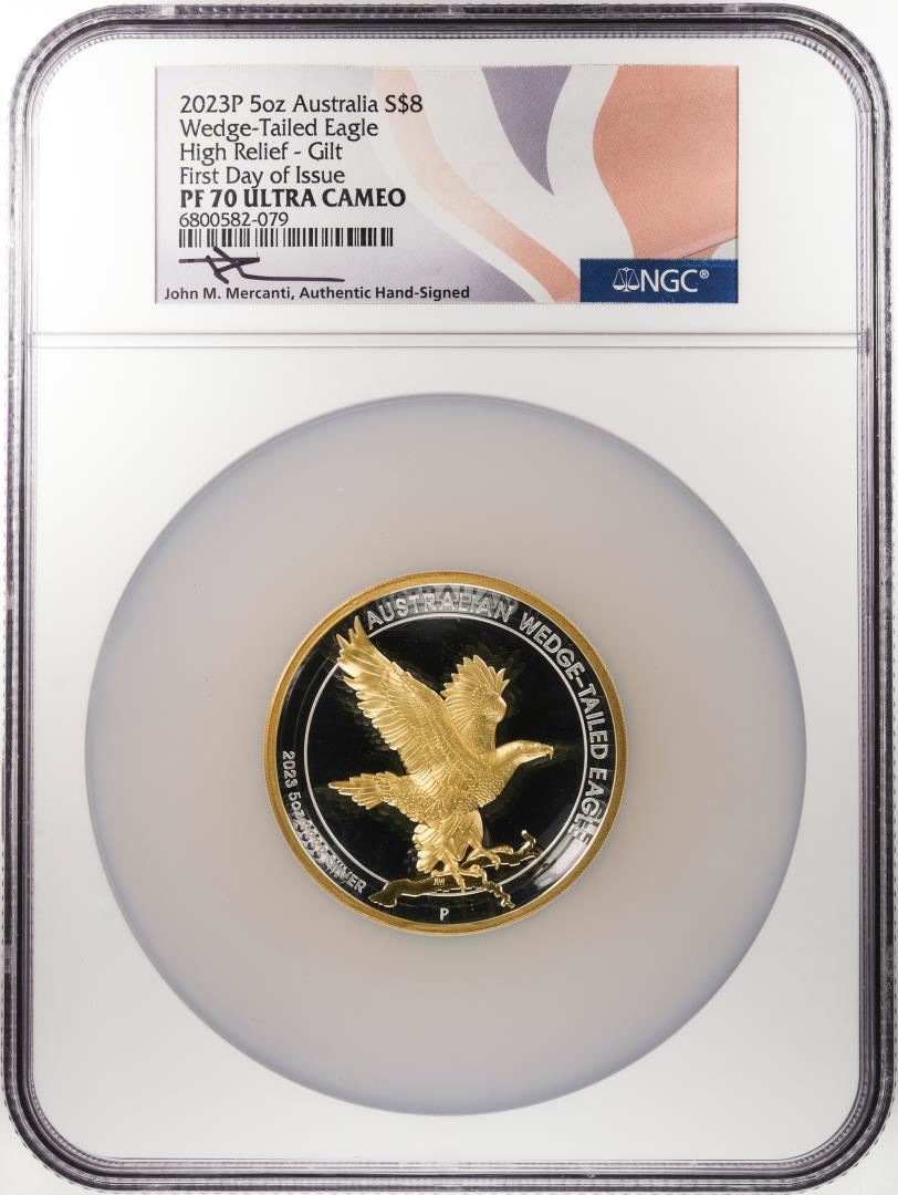One 2023P Australia $8 Wedge-Tailed Eagle HR 5 oz Silver Gilt Coin NGC PF70 UC FDOI. NGC Certified.
