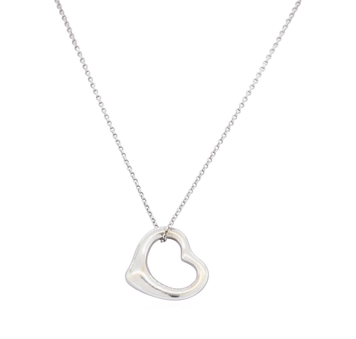 One lady's pendant with chain featuring: a 22KT White Gold heart shaped pendant attached to a 16 inch 1 millimeter rounded cable link 14KT White Gold chain weighing a total of 4.4 grams.