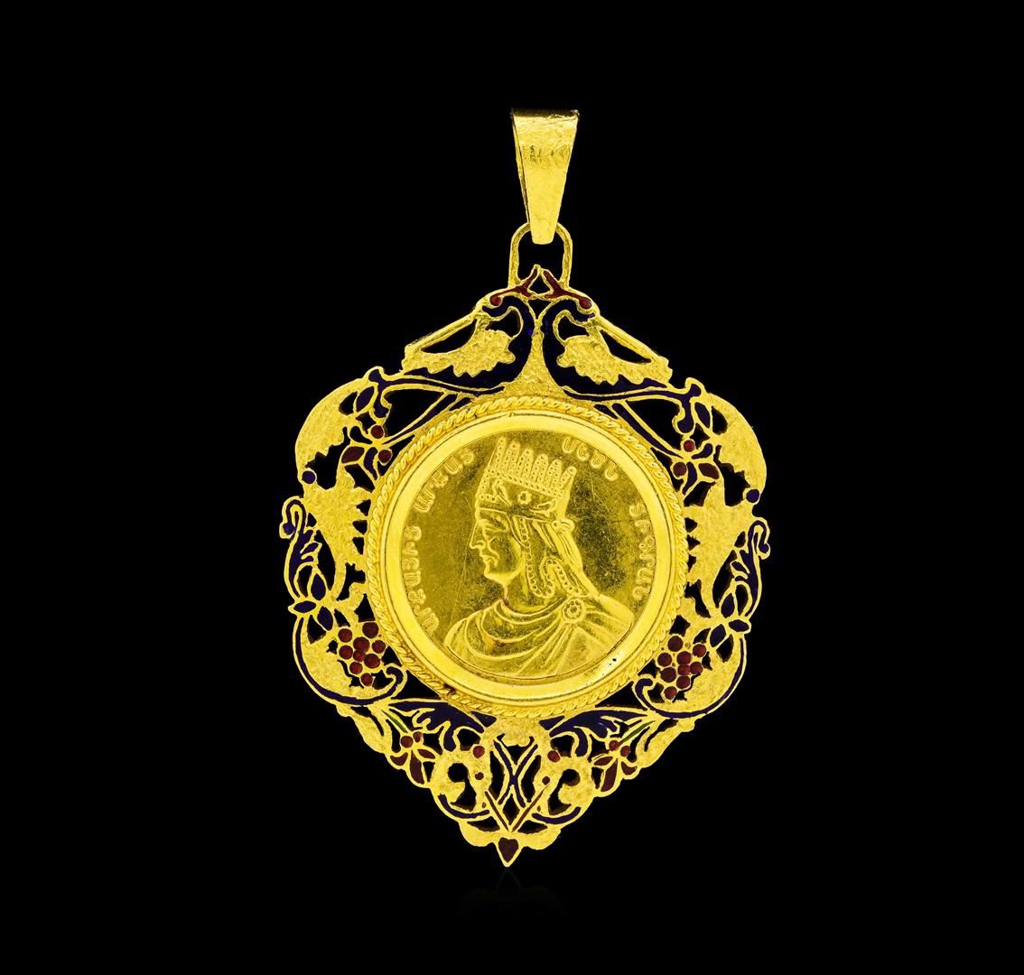 One Dikran the Great pendant with inlaid blue and red enamel featuring: 22KT yellow gold weighing 19.4 grams.