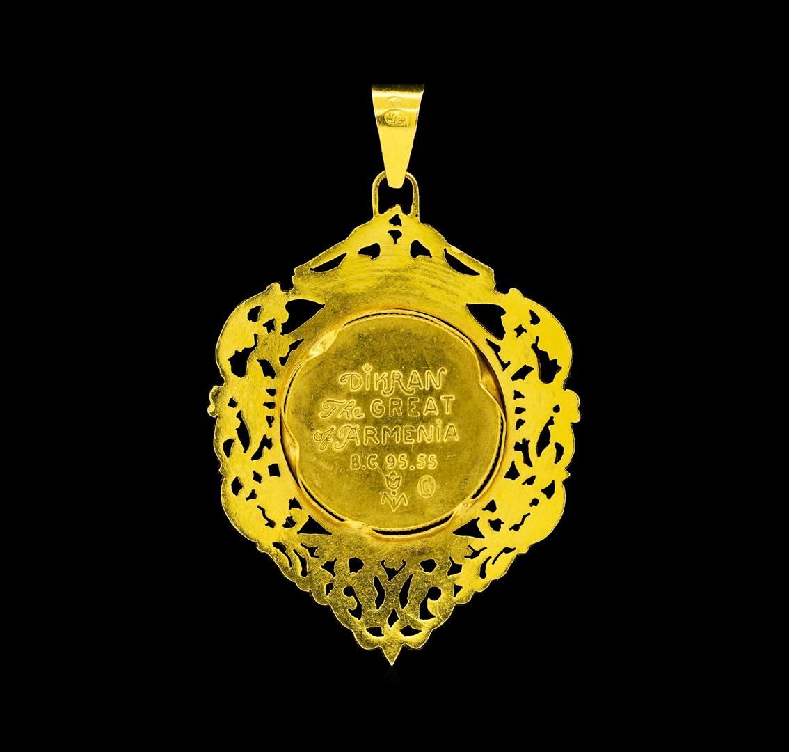 One Dikran the Great pendant with inlaid blue and red enamel featuring: 22KT yellow gold weighing 19.4 grams.