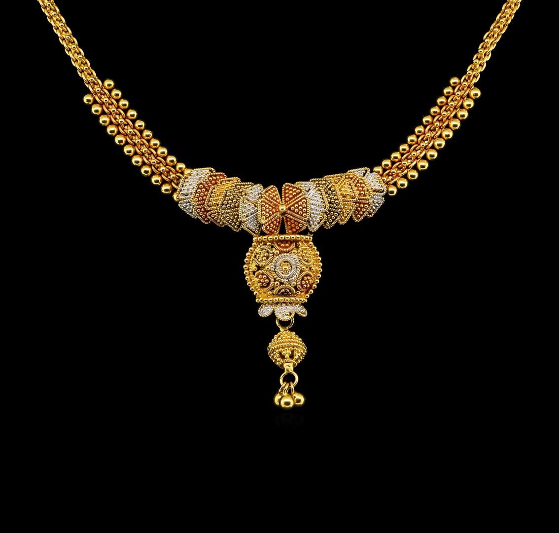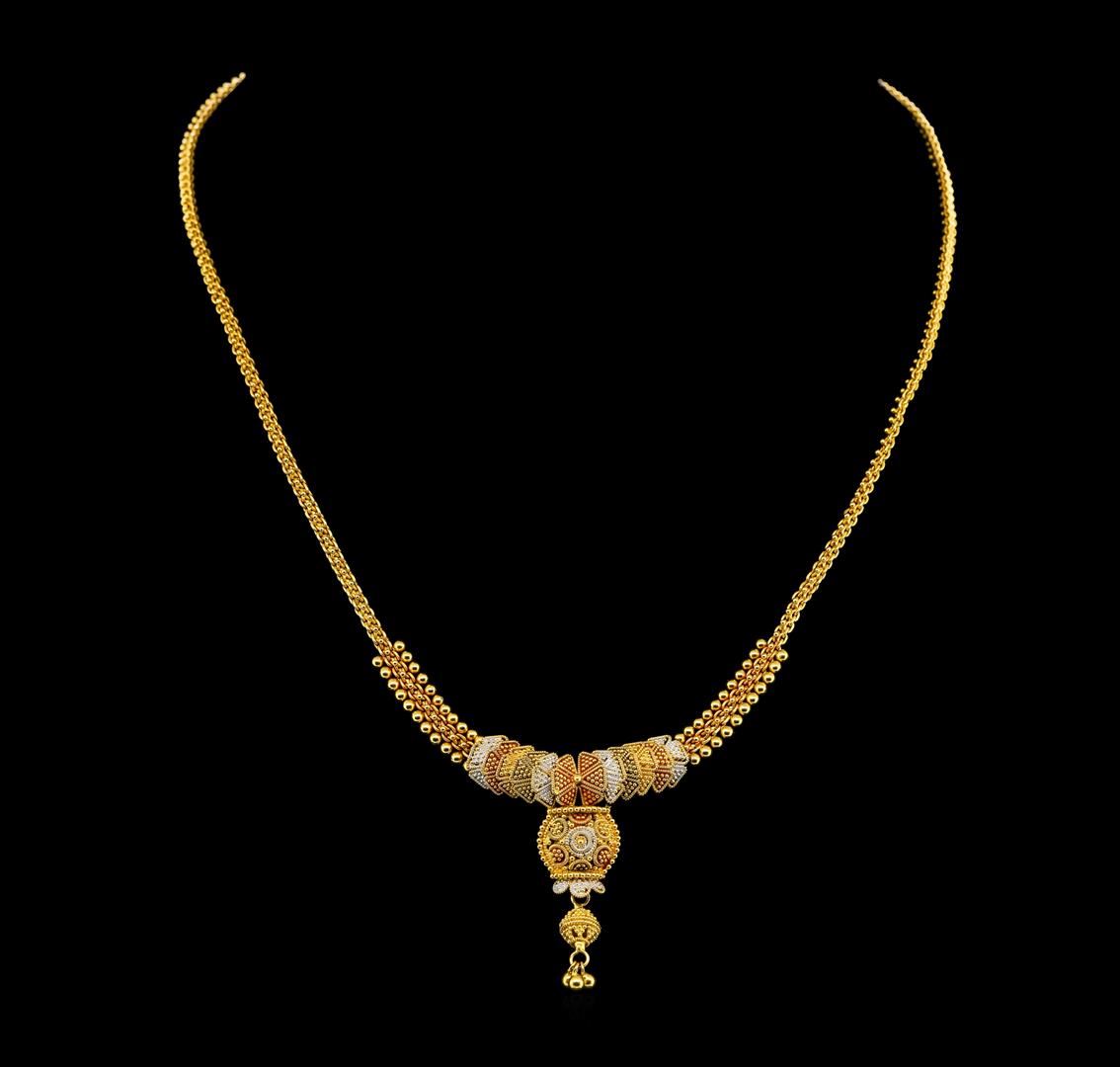 One lady's necklace with a fish hook clasp featuring: 22KT yellow gold with white, rose and black rhodium accents weighing 15.4 grams, measuring approximately 15.5 inches in length.