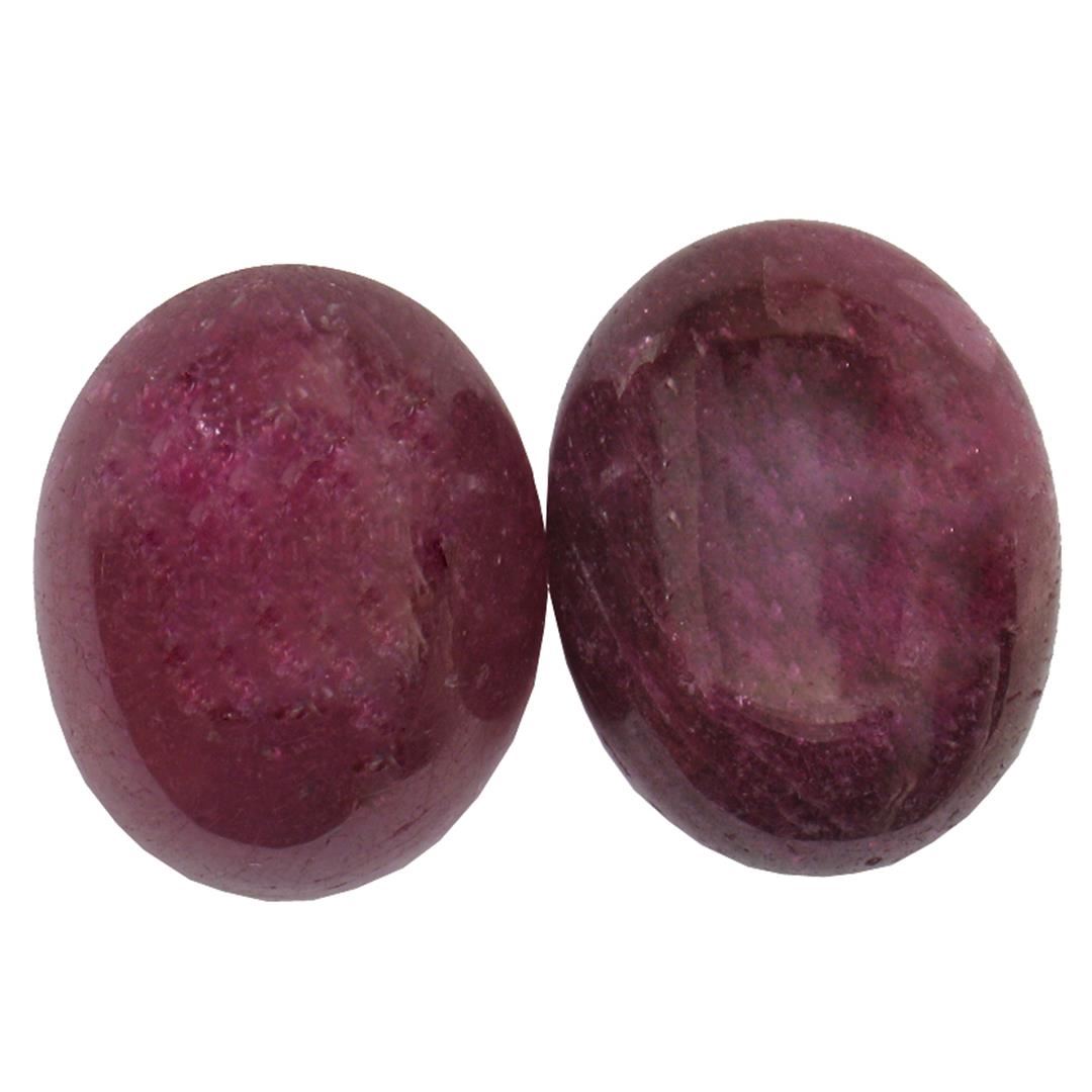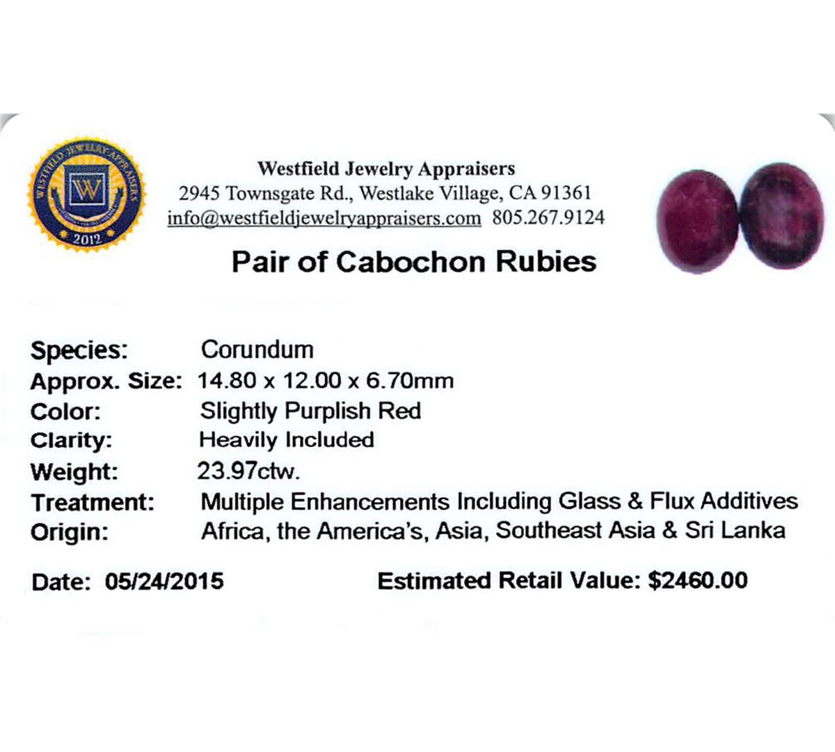 Two oval cabochon cut natural rubies, measuring 14.80 x 12.00 x 6.70mm, exact total weight 23.97ct., clarity is heavily included, type II, dark, very slightly brownish, slightly purplish red color, (GIA slpR 7/3), cut is good. Transmitting light diffusely, opaque. Naturally occurring internal & external characteristics are present. Indications of laboratory high temperature heat treatment, with glass & flux additives. Ruby has a low tolerance to rhodium plating, repolishing the surface, & ultrasonic cleaning. UGS Appraised at $2,460.00.