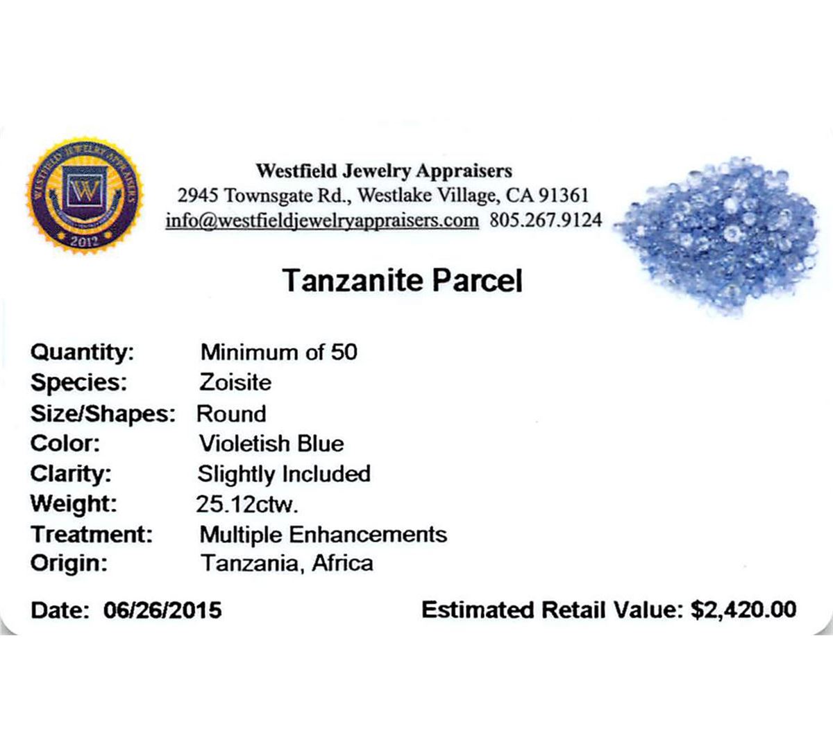 Fifty round mixed cut natural tanzanites, measuring 2.00 - 2.00 x 1.30 mm, exact total weight 25.12ct., clarity is slightly included, type I, medium light, very slightly grayish, violetish blue color, (GIA vB 4/3), cut is good. Measurements & the color grade are an average for the group, Color grade is an average for the group, Transmitting light with no distortion, transparent, Naturally occurring internal & external characteristics are present, Indications of multiple laboratory enhancements, including high temperature heat treatment. UGS Appraised at $2,420.00.