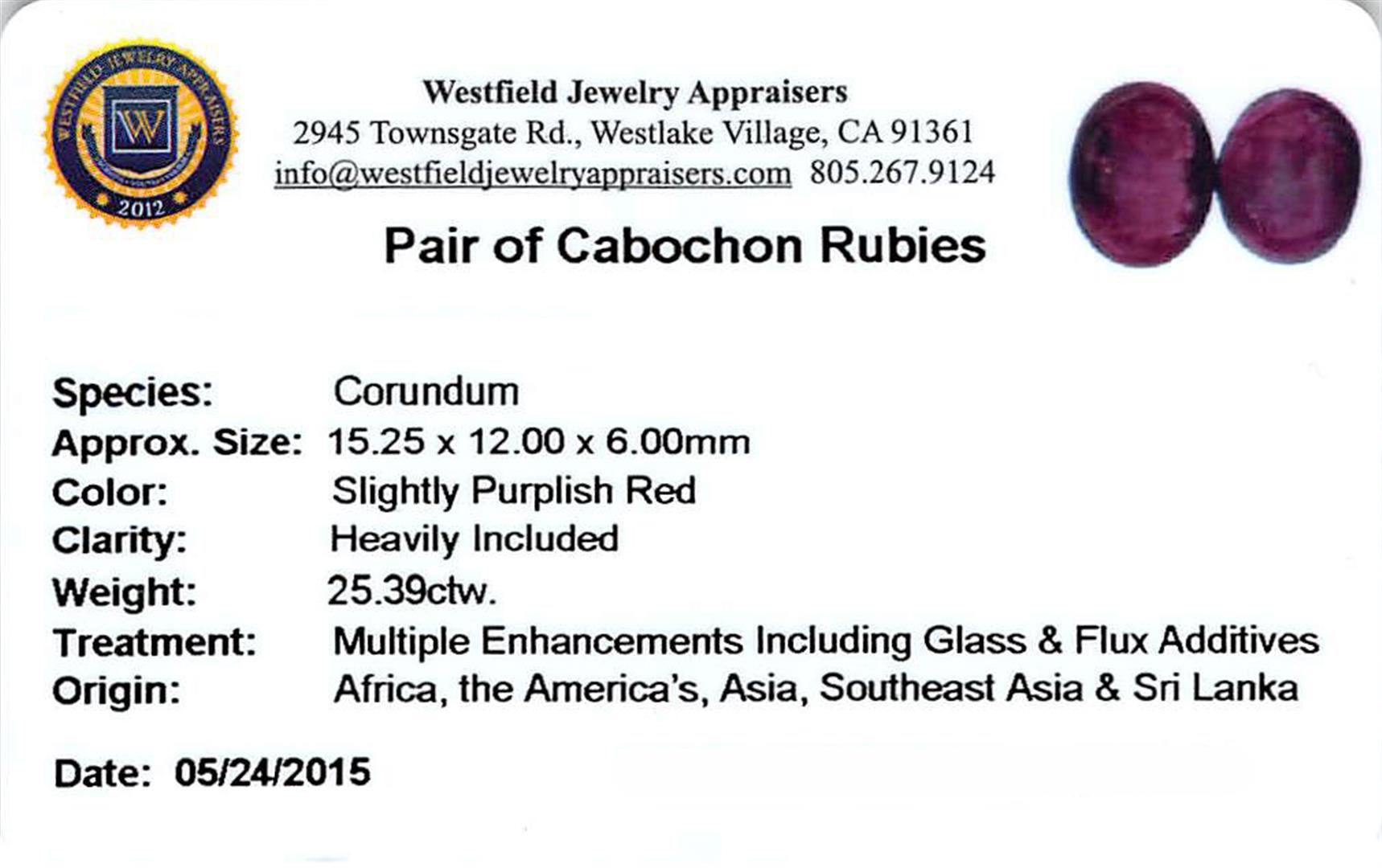 Two oval cabochon cut natural rubies, measuring 15.25 x 12.00 x 6.00mm, exact total weight 25.39ct., clarity is heavily included, type II, dark, very slightly brownish, slightly purplish red color, (GIA slpR 7/3), cut is good. Transmitting light diffusely, opaque. Naturally occurring internal & external characteristics are present. Indications of laboratory high temperature heat treatment, with glass & flux additives. Ruby has a low tolerance to rhodium plating, repolishing the surface, & ultrasonic cleaning. UGS Appraised.