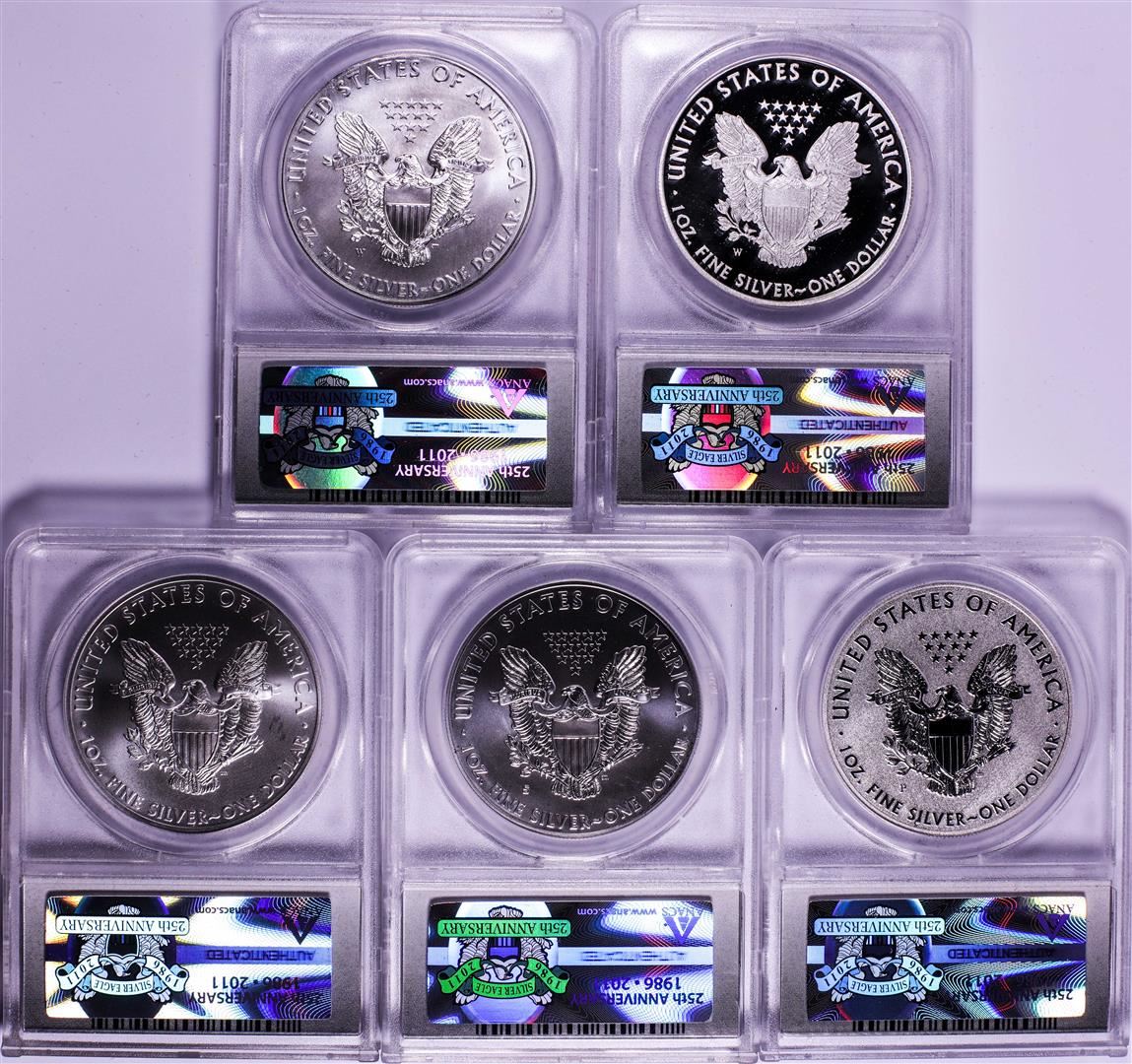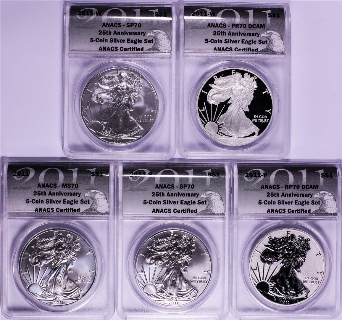 25th Anniversary 2011 $1 American Silver Eagle (5) Coin Set ANACS MS70/SP70/PR70/RP70
