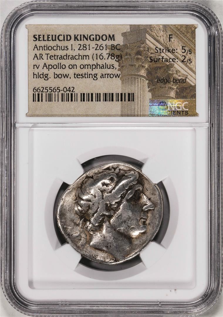 One 281-261 BC Seleucid Kingdom Antiochus I AR Tetradrachm Ancient Coin NGC F. NGC Certified.