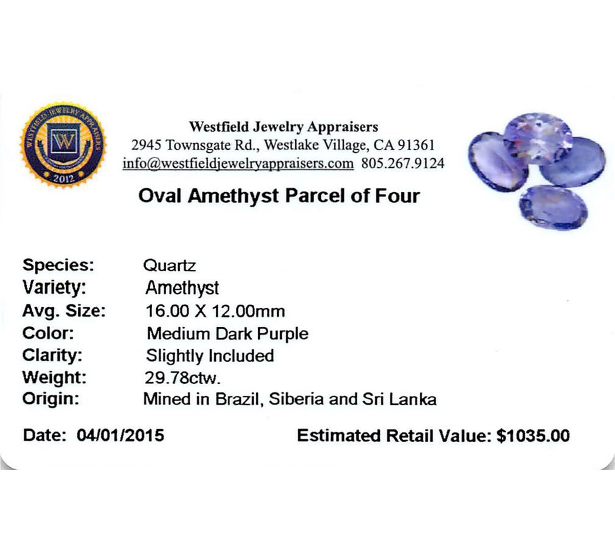 Four oval mixed cut natural amethysts exact total weight 29.78ct., clarity is slightly included, type II, medium dark, very slightly grayish, purple color, (GIA P 6/3), cut is good. UGS Appraised at $1,035.00.
