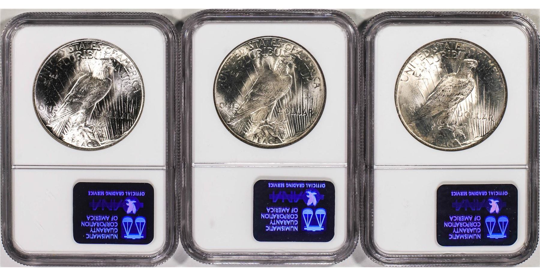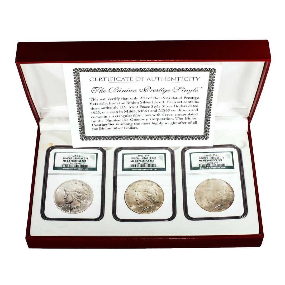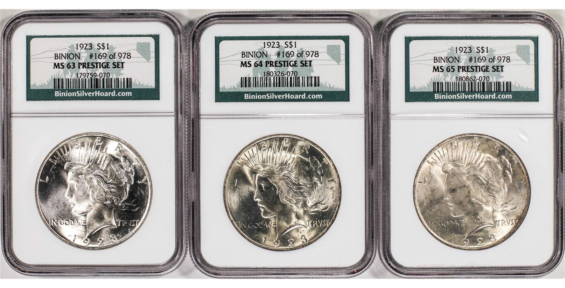 One (3) 1923 $1 Peace Silver Dollar Coins NGC MS63/64/65 Prestige Set Binion Collection. NGC Certified.
