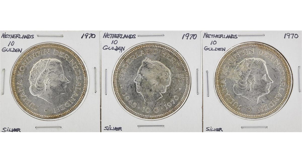 One (3) 1970 Netherlands 10 Gulden Silver Coins.