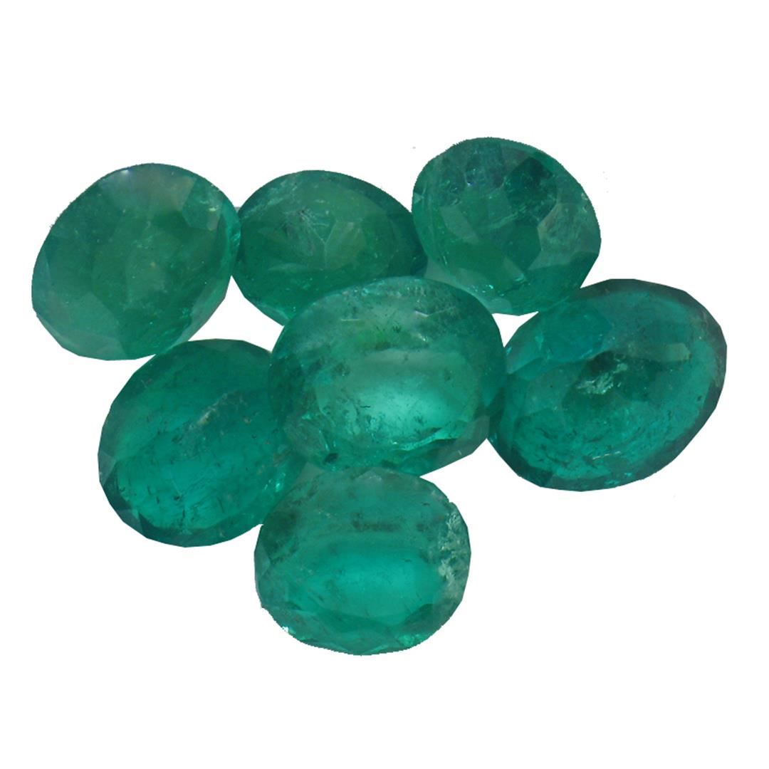 Seven oval mixed cut natural emeralds exact total weight 3.85ct., clarity is heavily included, type III, medium dark, very slightly grayish, very slightly bluish green color, (GIA vslbG 6/3), cut is good. UGS Appraised at $1,110.00.