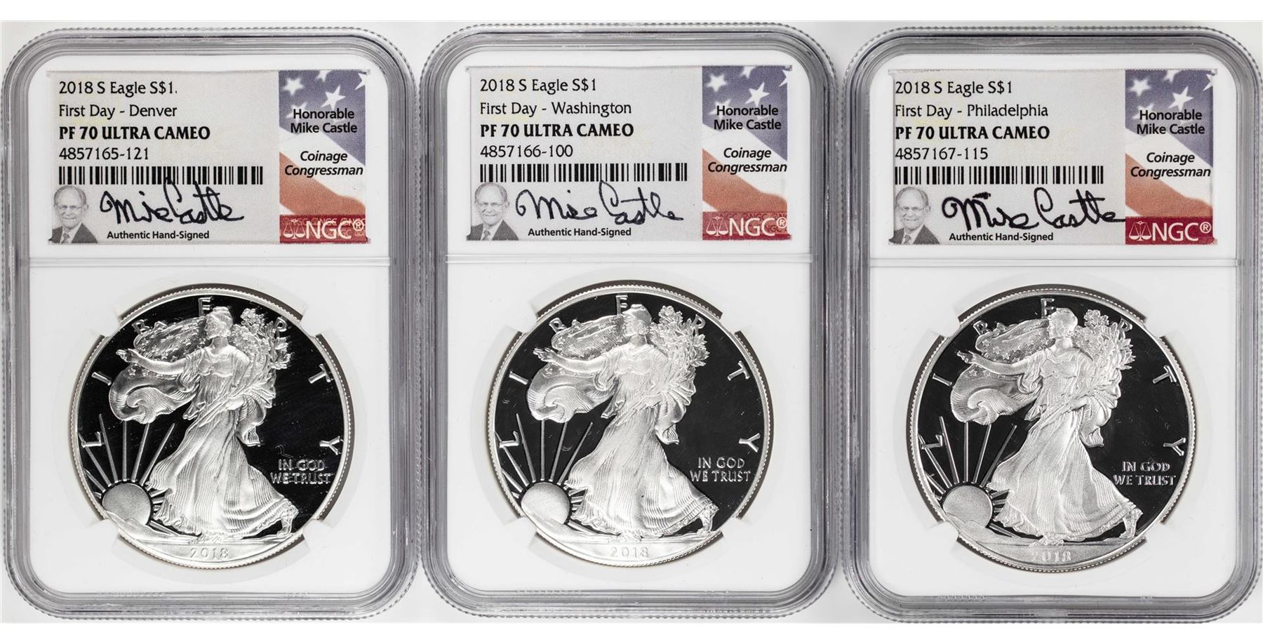 One (3) Coin 2018-S $1 Proof Silver Eagle Location Set NGC PF70 Ultra Cameo First Day Castle. NGC Certified.