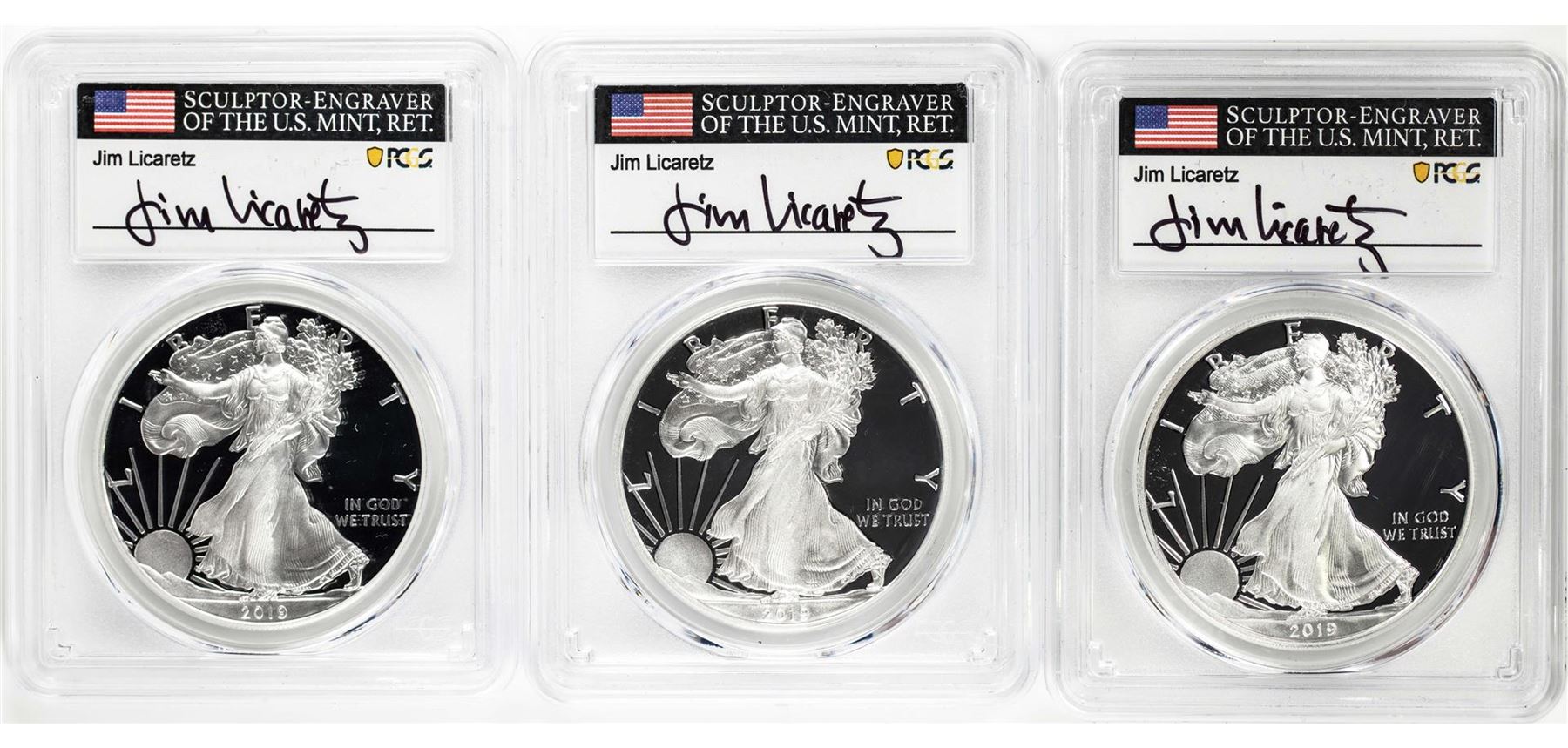 (3) Coin 2019-S $1 Proof Silver Eagle Location Set PCGS PR70 FDOI Licaretz Signature