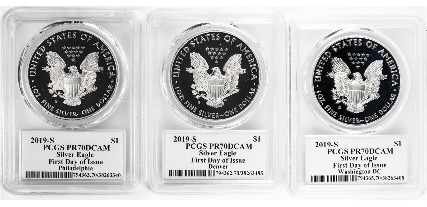 One (3) Coin 2019-S $1 Proof Silver Eagle Location Set PCGS PR70 FDOI Licaretz Signature. PCGS Graded.