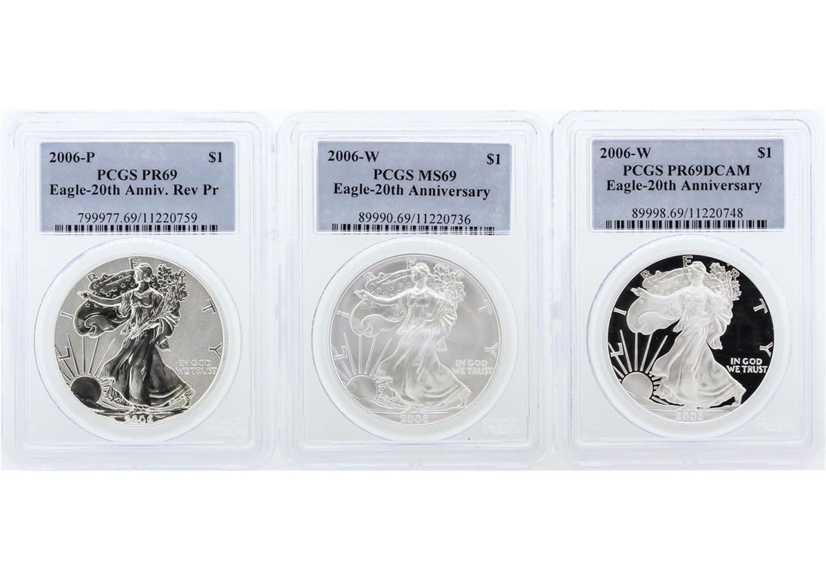 This (3) Coin set includes 1 of each of the following coins: 2006-P Silver Eagle 20th Anniversary Coin PCGS PR69 Reverse Proof, 2006-W Silver Eagle 20th Anniversary Coin PCGS MS69, and a 2006-W Silver Eagle 2th Anniversary Coin PCGS PR69DCAM. This would make a great start or addition to any collection of U.S. coins. PCGS Graded.