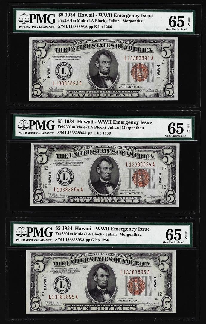 One (3) Consec. 1934 $5 Hawaii WWII Emergency Issue Federal Reserve Notes PMG Gem Unc 65EPQ. PMG Certified.