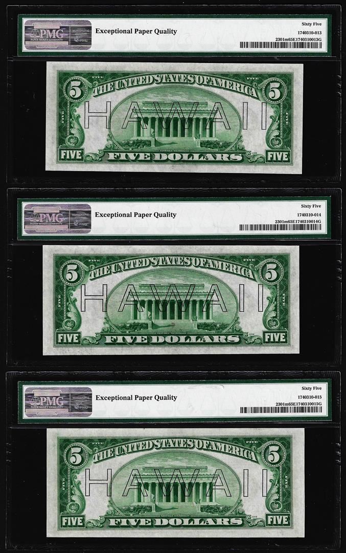 One (3) Consec. 1934 $5 Hawaii WWII Emergency Issue Federal Reserve Notes PMG Gem Unc 65EPQ. PMG Certified.