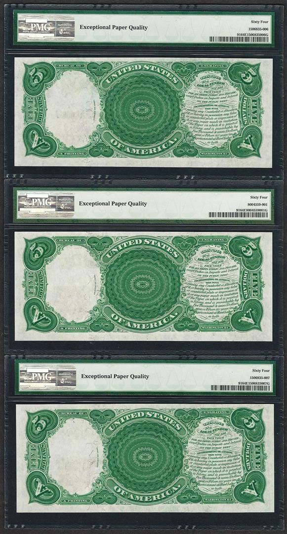 One (3) Consecutive 1907 $5 Woodchopper Legal Tender Note PMG Choice Uncirculated 64EPQ. PMG Certified.
