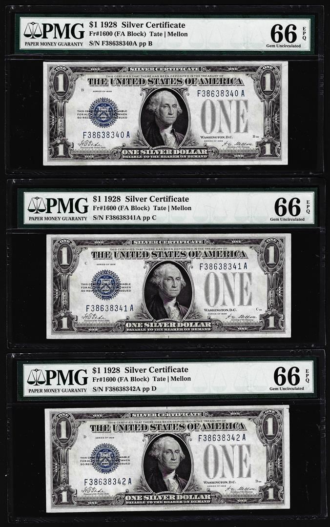 One (3) Consecutive 1928 $1 Silver Certificate Notes Fr.1600 PMG Gem Uncirculated 66EPQ. PMG Certified.