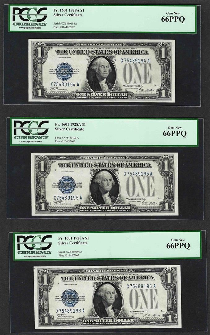 One Lot of (3) Consecutive 1928A $1 Funnyback Silver Certificate Notes Fr.1601 PCGS Gem New 66PPQ. PCGS Graded.