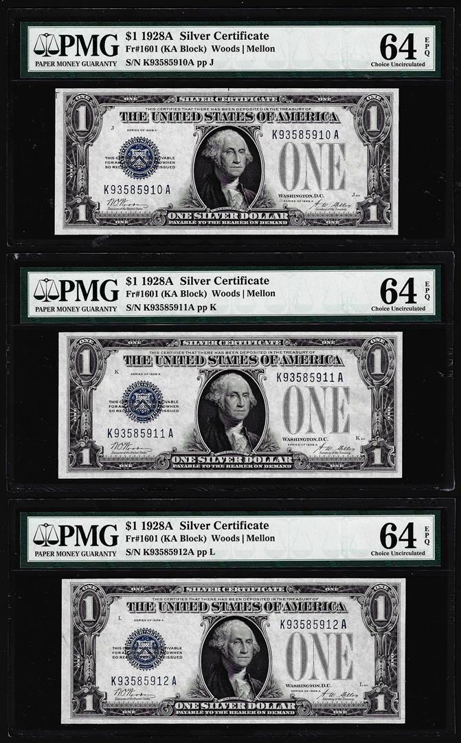 One (3) Consecutive 1928A $1 Funnyback Silver Certificate Notes Fr.1601 PMG Choice Uncirculated 64EPQ. PMG Certified.