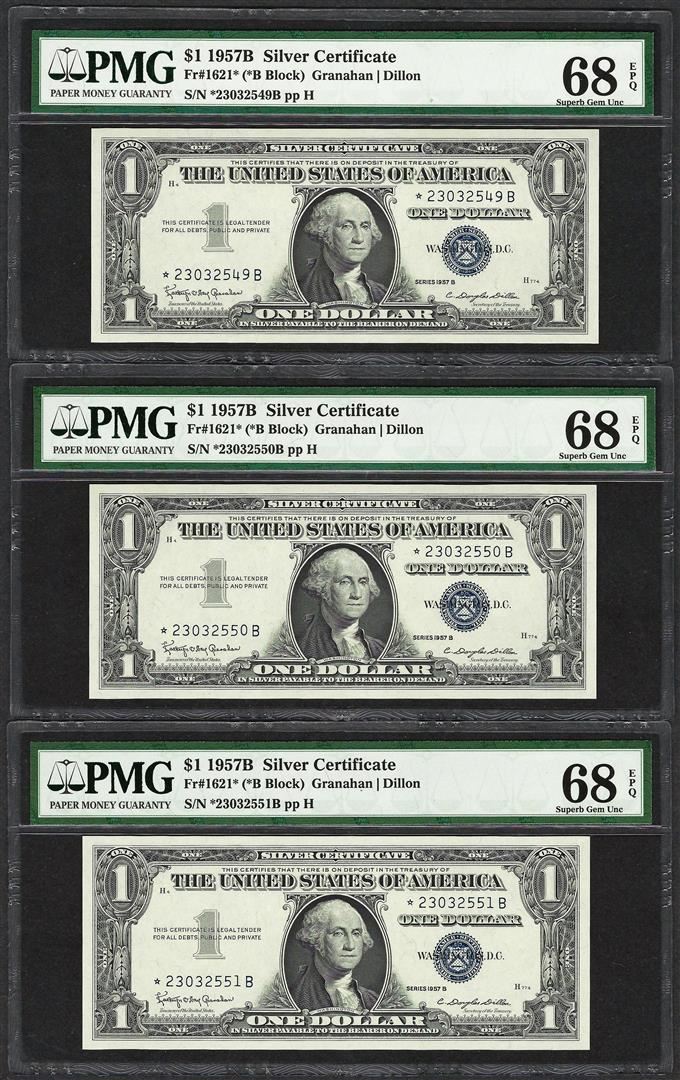 (3) Consecutive 1957B $1 Silver Certificate STAR Notes PMG Superb Gem Unc. 68PPQ