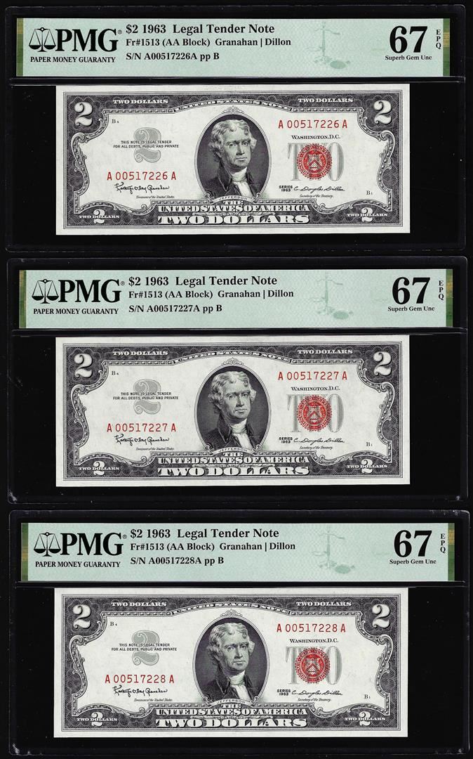 (3) Consecutive 1963 $2 Legal Tender Notes Fr.1513 PMG Superb Gem Uncirculated 67EPQ