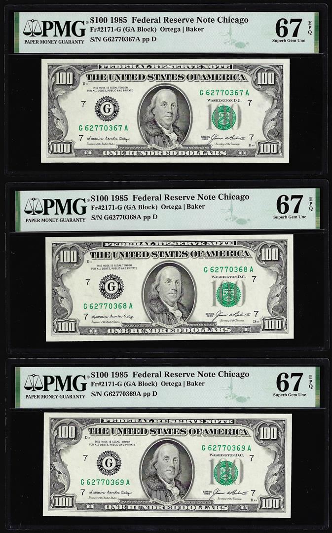 One (3) Consecutive 1985 $100 Federal Reserve Notes Fr.2171-G PMG Superb Gem Unc 67EPQ. PMG Certified.