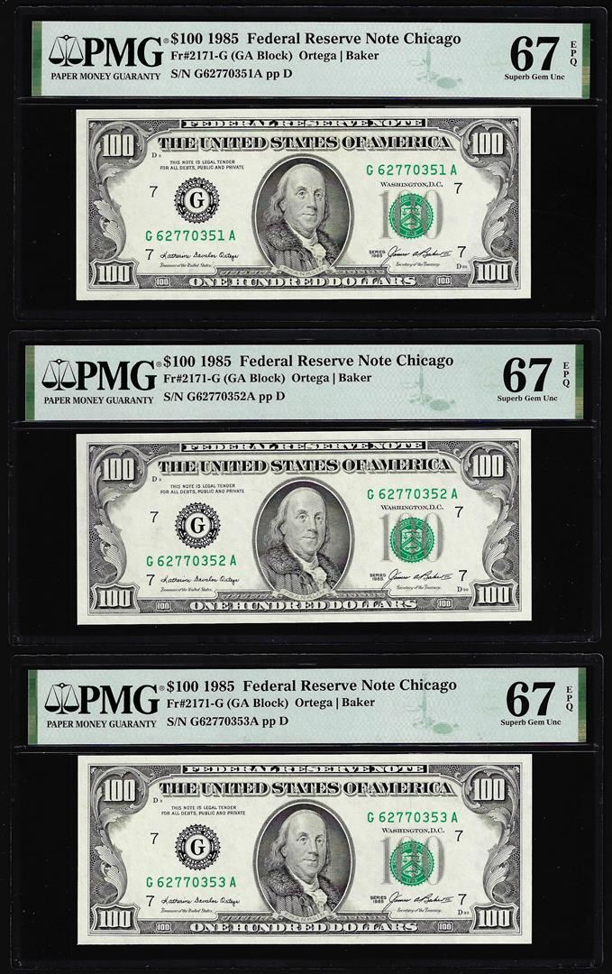 One (3) Consecutive 1985 $100 Federal Reserve Notes Fr.2171-G PMG Superb Gem Unc 67EPQ. PMG Certified.