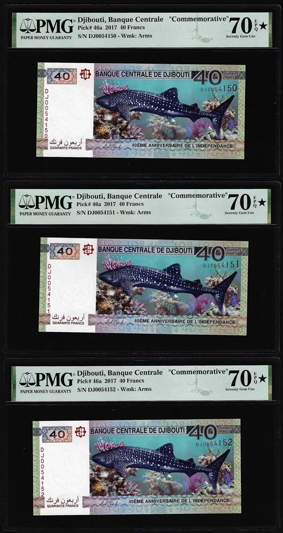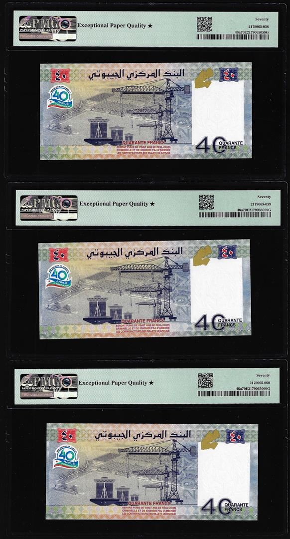 One (3) Consecutive 2017 Djibouti 40 Francs Bank Notes PMG Seventy Gem Uncirculated 70EPQ*. PMG Certified.