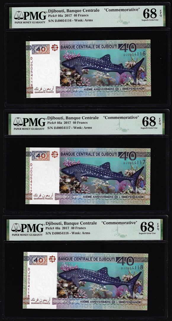 One (3) Consecutive 2017 Djibouti 40 Francs Bank Notes PMG Superb Gem Uncirculated 68EPQ. PMG Certified.