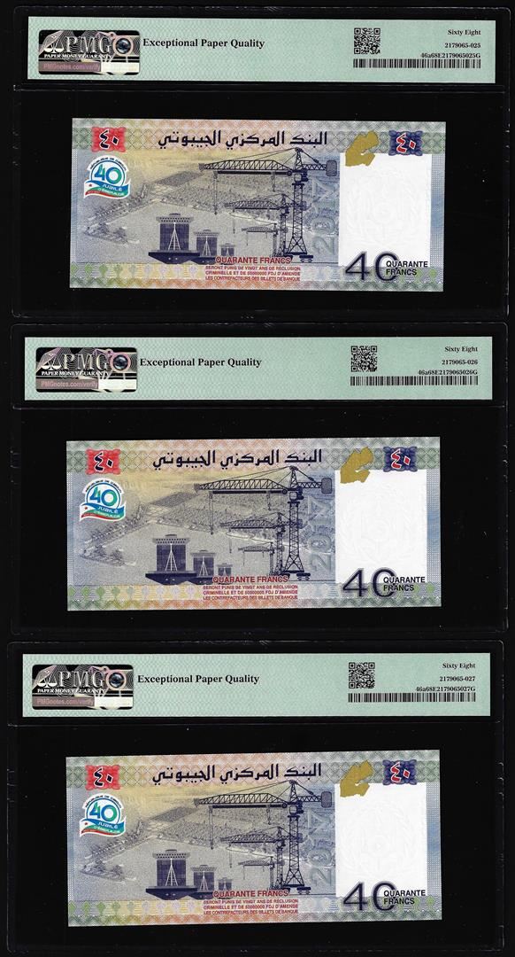 (3) Consecutive 2017 Djibouti 40 Francs Bank Notes PMG Superb Gem Uncirculated 68EPQ