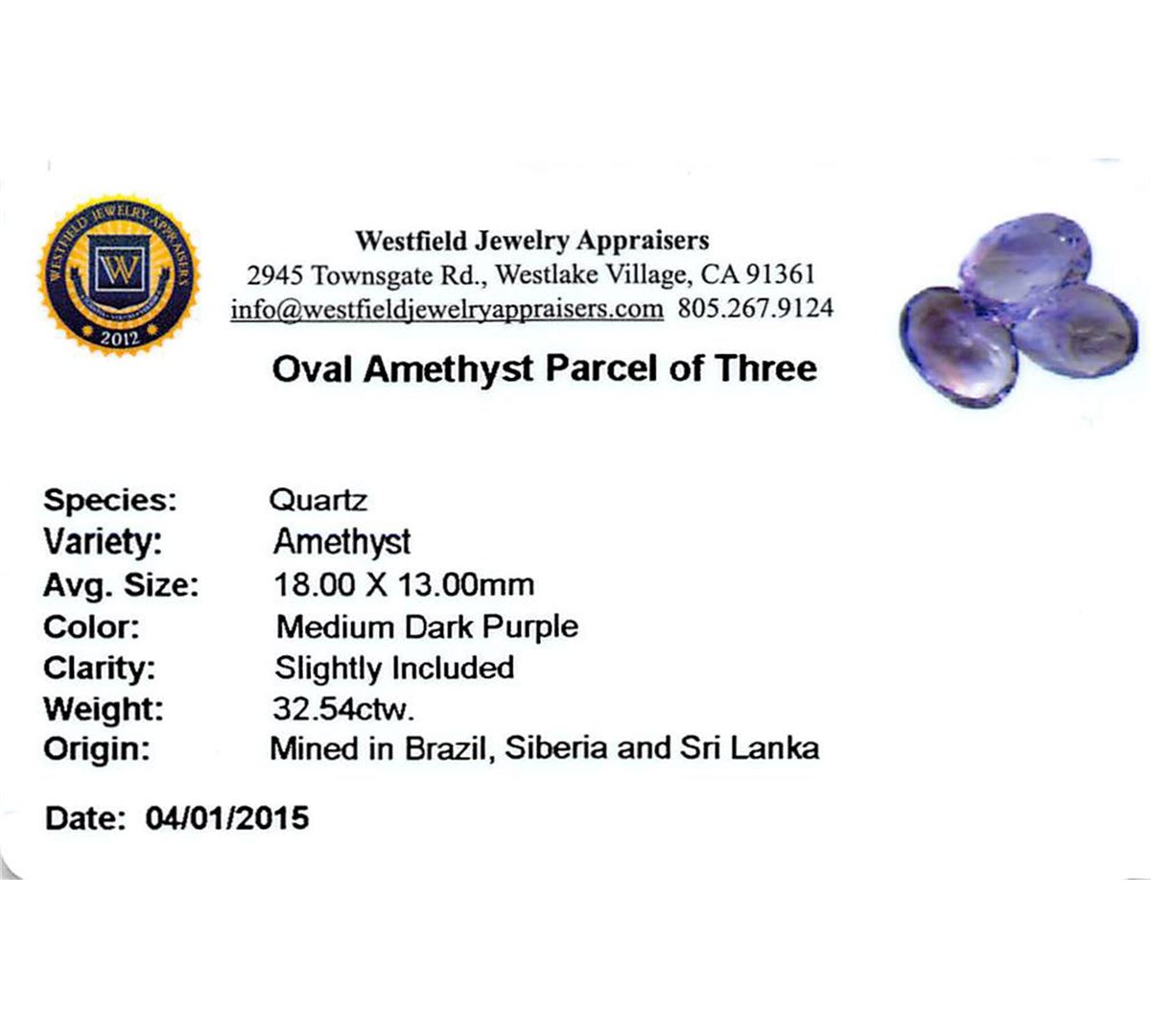 Three oval mixed cut natural ametrine quartzs exact total weight 32.54ct., clarity is slightly included, type I, medium dark, very slightly grayish, purple color, (GIA P 6/3), cut is good. UGS Appraised.