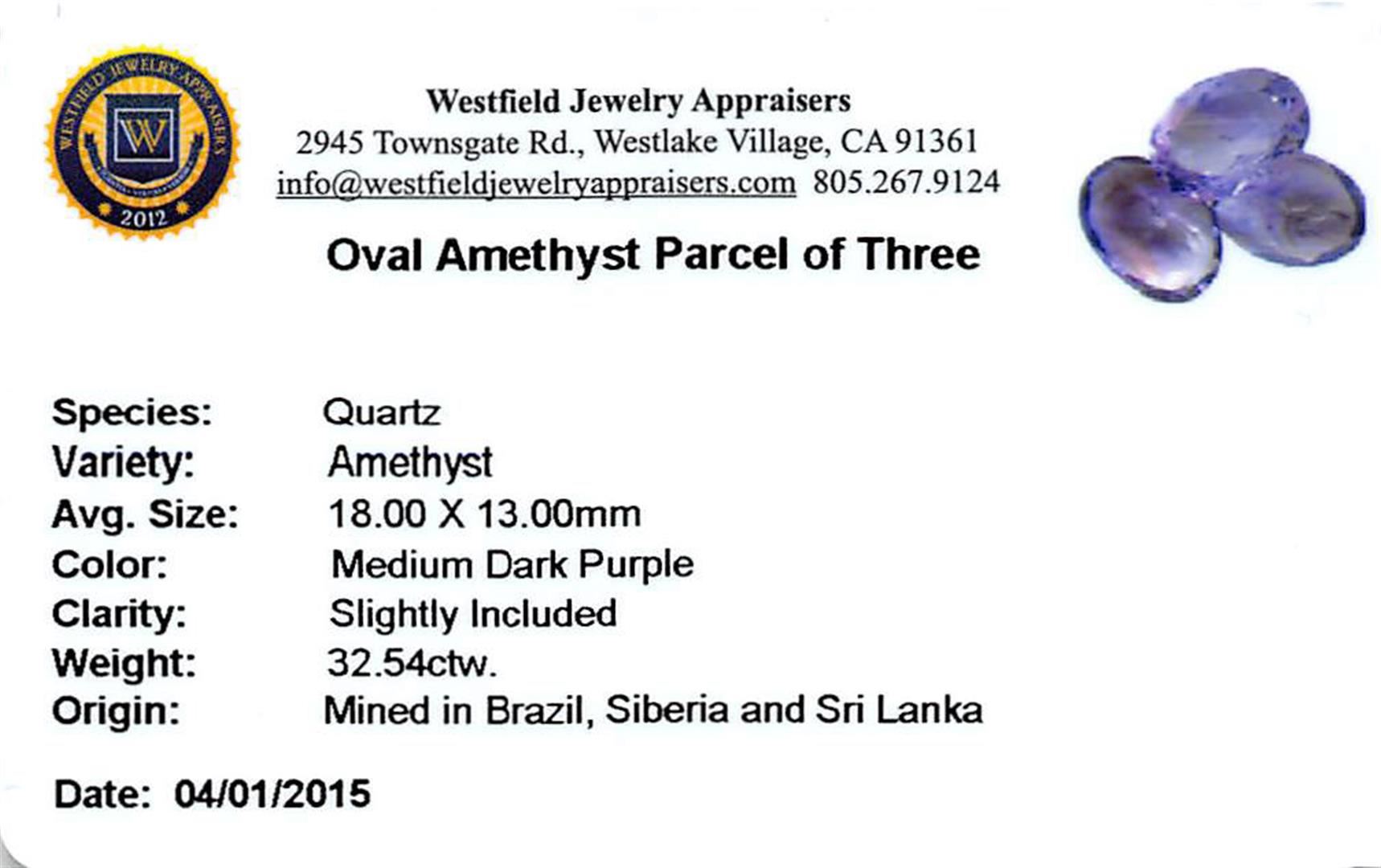 Three oval mixed cut natural ametrine quartzs exact total weight 32.54ct., clarity is slightly included, type I, medium dark, very slightly grayish, purple color, (GIA P 6/3), cut is good. UGS Appraised.